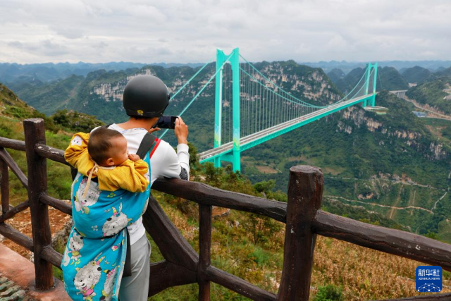 9月27日,当地群众背着孩子前来参观大桥。
