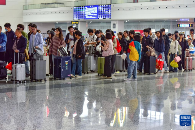 10月8日,旅客在安徽阜阳西站候车大厅排队准备检票乘车。