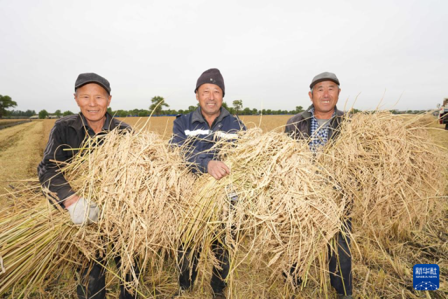 10月11日,在位于黑龙江省哈尔滨市的北大荒集团闫家岗农场有限公司,农户抱着刚收获的水稻合影留念。