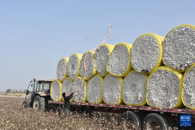 10月21日,在新疆阿克苏地区沙雅县的棉田中,棉农在固定棉花包。