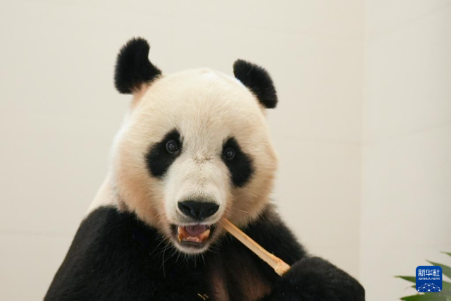 11月4日,在中国大熊猫保护研究中心绵阳基地,大熊猫“华豹”入住圈舍后吃竹子。