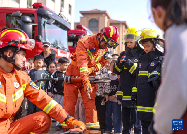 11月7日,在山东威海荣成市消防救援大队消防站,消防员为学生演示消防救援器材的使用方法。