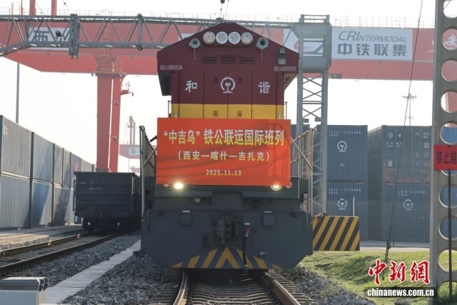 11月13日,陕西西安,满载45个集装箱汽车零配件的X9015次列车从西安国际港站驶出,一路向西经新疆喀什出境,穿越吉尔吉斯斯坦,最终开往乌兹别克斯坦吉扎克,标志着陕西首趟“中吉乌”铁公联运国际班列顺利开行。图为班列整装待发。