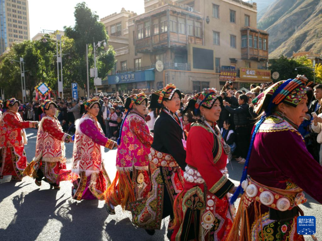 11月19日,在四川省汶川县城,身着民族服饰的妇女在非遗大巡游活动上表演。