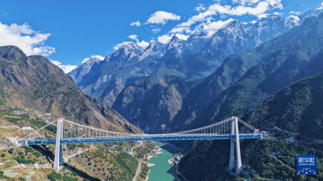 这是11月21日拍摄的虎跳峡金沙江铁路大桥。大桥全长882.5米,起于玉龙雪山隧道出口,止于哈巴雪山隧道进口,是丽香铁路的重点控制性工程(无人机照片)。