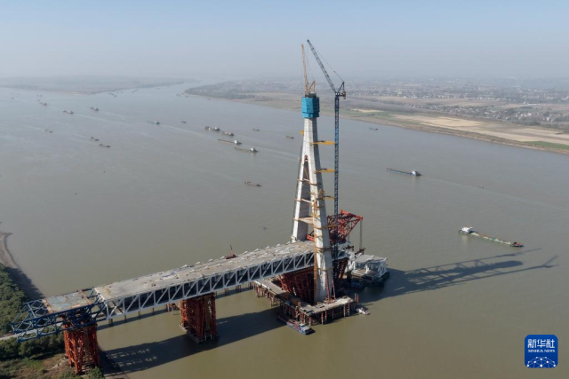 11月28日拍摄的池州长江公铁大桥4号主塔施工现场(无人机照片)。