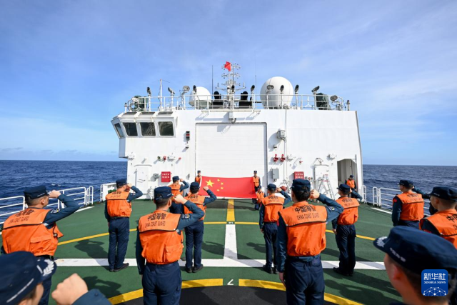 近日,在黄岩岛附近海域执行常态化巡航任务的中国海警黄岩舰执法员举行纪念仪式,为南京大屠杀死难者脱帽默哀。默哀毕,执法员们重温誓词,坚决维护我国海洋权益、捍卫领土主权完整。