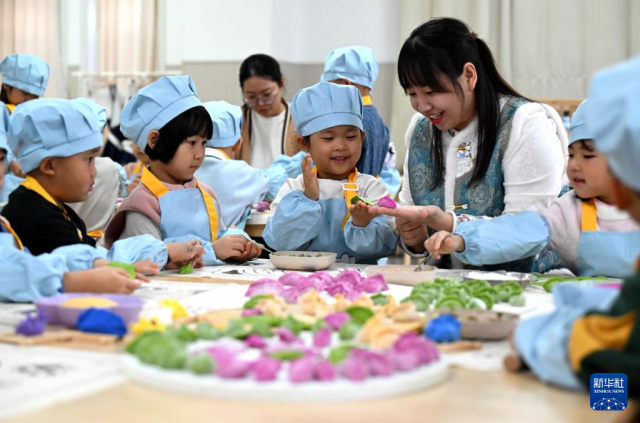 12月19日,在河北省石家庄市新华区第一幼儿园,老师指导小朋友们包饺子。