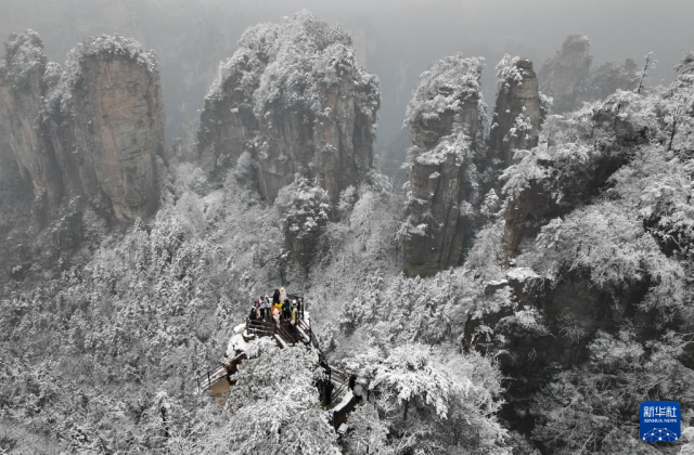 1月2日,游客在湖南省张家界国家森林公园黄石寨景区赏雪游玩(无人机照片)。