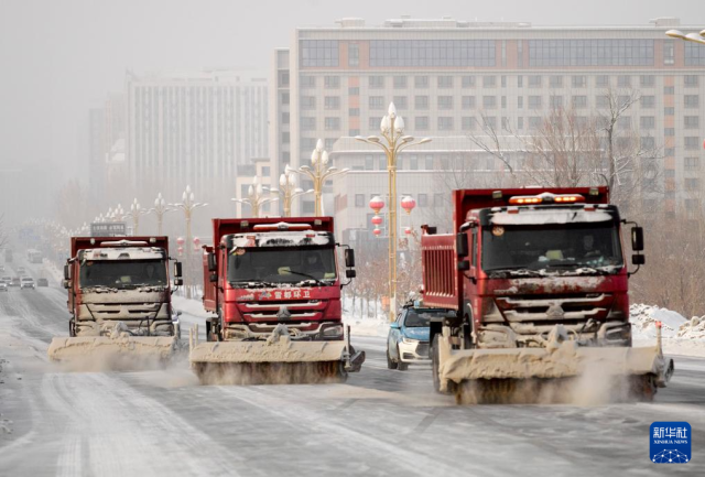 1月13日,清雪车辆在新疆阿勒泰市道路上除雪。