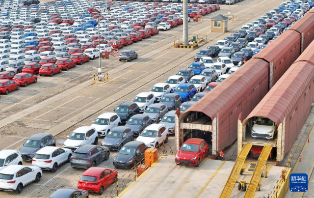 1月14日,在山东港口烟台港,国产汽车从商品车班列中驶出到码头集结等待装船出口(无人机照片)。