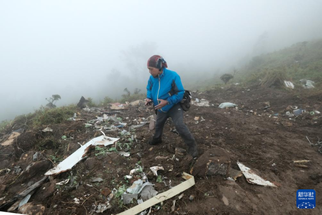 1月18日,在印度尼西亚南苏拉威西省庞卡杰内和群岛县布卢萨拉翁山,一名记者站在失联飞机残骸旁。