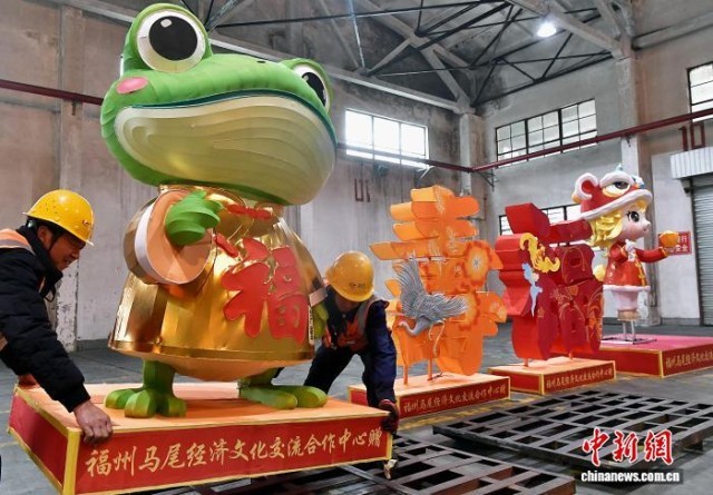 1月28日,第二十四届“两马同春闹元宵”活动福州马尾赠马祖的28组灯组,在福州青州集装箱码头装箱,计划运往马祖,亮相当地灯会。该组花灯既包含有东引岛灯塔、青蛙神等马祖标志性元素,亦蕴含着福禄寿喜的新春祝愿。“两马同春闹元宵”灯会起源于马尾-马祖元宵节俗,是马尾、马祖两地间开展最早且已常态化的一个双向交流活动,互赠花灯是其一大特色传统。2008年,元宵节(马尾-马祖元宵节俗)被列入第二批国家级非物质文化遗产代表性项目名录。第二十四届“两马同春闹元宵”灯会将于2月4日在位于福州的中国船政文化园正式亮灯。图为工作人员在搬运花灯进行装箱作业。中新社记者 张斌 摄