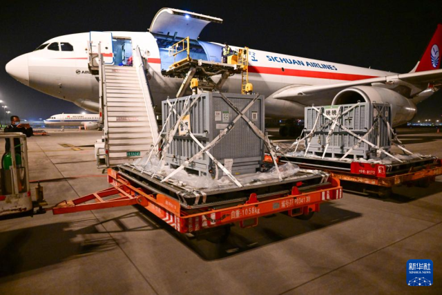 1月28日凌晨,大熊猫“晓晓”“蕾蕾”飞抵成都天府国际机场。