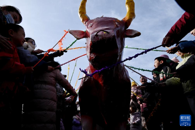 2月4日,人们在甘肃省敦煌市白马塔景区“打春牛”。