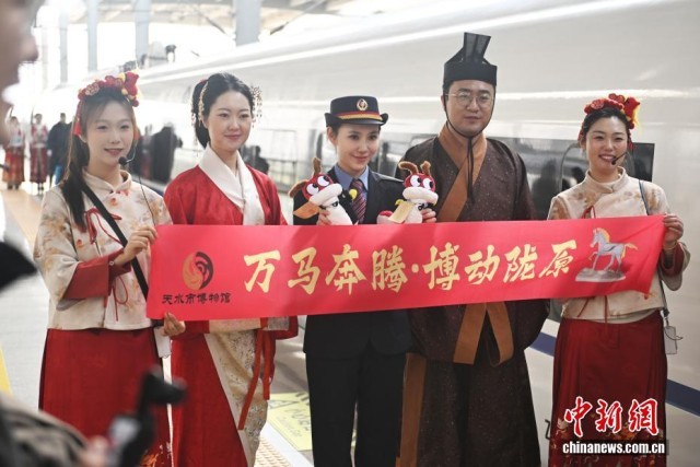 2月9日,中国首列全贯通车厢“高铁流动博物馆”文化主题列车(G848次)从兰州西站启程驶向广州南站。该“博物馆”以高铁为媒,“万马奔腾·博动陇原”为主题,将敦煌研究院、甘肃省博物馆、甘肃简牍博物馆、兰州市博物馆、天水市博物馆、武威市博物馆、平凉市博物馆、临夏州彩陶馆(临夏州博物馆)、和政古动物化石博物馆9家国家一级博物馆“搬”上列车,让每一节车厢都成为一座特色鲜明的微缩博物馆,在春运的热潮中,开启了一场跨越2600多公里的文脉传播之旅。图为工作人员欢迎旅客。