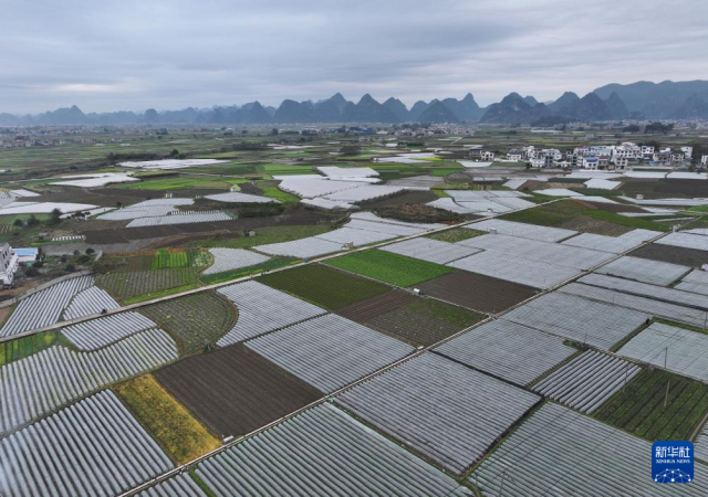 2月11日,在柳州市柳江区成团镇,村民在田间劳作(无人机照片)。