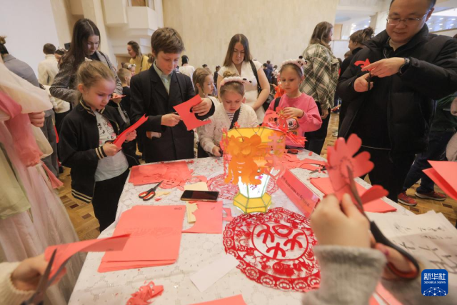 2月14日,在俄罗斯圣彼得堡,当地民众体验剪纸。