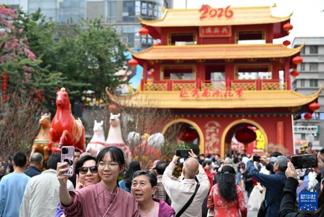 2月15日,在广州越秀西湖花市,游客拍照留念。