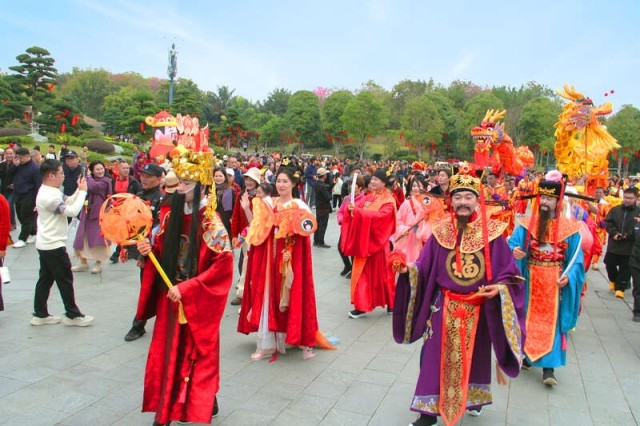 2月17日,广西南宁,南宁园博园景区内,民俗巡游队伍吸引众多游客驻足观看。正月初一至初七,南宁园博园打造一场集庙会闯关、民俗巡游、萌宠互动、烟花秀、浪漫花海、国风“飘雪”的新春盛会,助力市民度过一个欢乐祥和的春节。丘子阳/摄