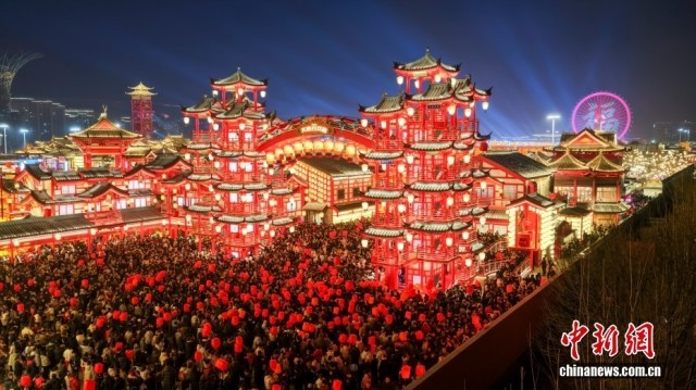 春节期间,各地新春活动流光溢彩,璀璨光影勾勒出浓浓年味。图为2月19日,河北省唐山市丰南区河头老街景区灯火璀璨,各地游客纷至沓来,坐游船、看美景、品民俗。