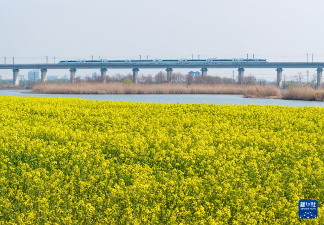 春日,在安徽省合肥市肥东县十八联圩生态湿地,油菜花竞相绽放,铺展成金色花海。高铁列车穿行其间,与碧水、飞鸟相映成趣,勾勒出一幅生动多彩的江淮大地春日图景。