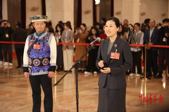 3月12日,北京人民大会堂,十四届全国人大四次会议第三场“代表通道”集中采访活动中,全国人大代表、海南省保亭黎族苗族自治县副县长吕妍(右)回答记者提问。这是今年两会最后一场“代表通道”采访活动,六位全国人大代表先后走上通道,面对中外媒体,讲述履职故事,分享发展感悟。中青报·中青网记者 王鑫昕/摄