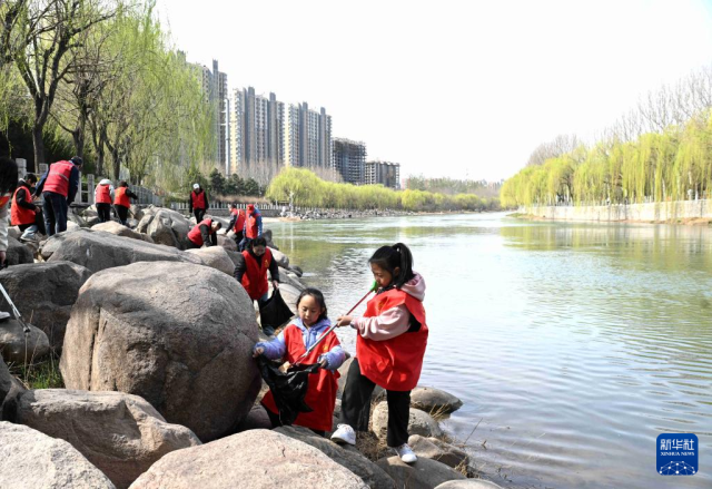 3月22日,小志愿者在河北省石家庄市新华区太平河畔捡拾垃圾。