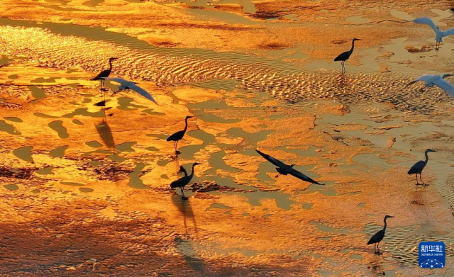 3月22日,候鸟在松花江哈尔滨段浅滩中休息觅食(无人机照片)。