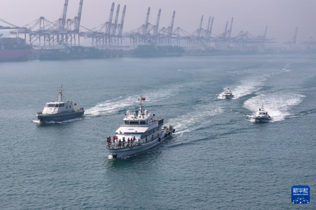 3月25日,执法船只在港区进行联合巡逻(无人机照片)。
