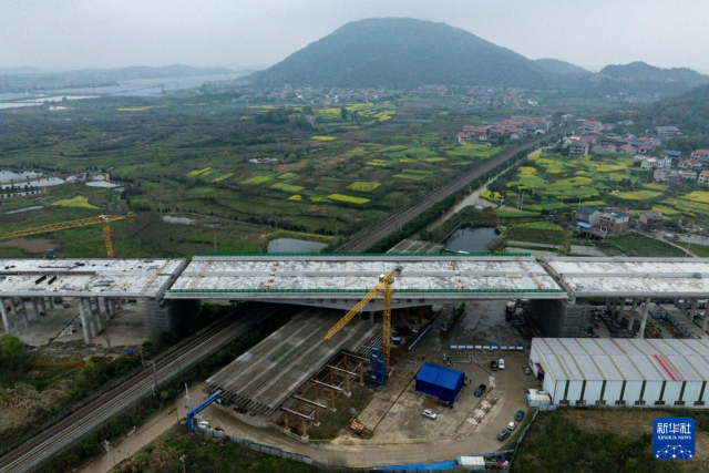 3月26日,由湖北交通投资集团投资建设、中铁十一局承建的鄂州机场高速公路二期工程跨武九铁路转体桥完成转体施工。