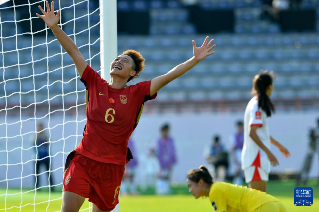 4月1日,中国队球员郑璐在比赛中庆祝进球。