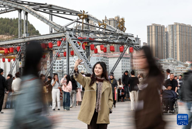 4月6日,游客在甘肃省兰州市中山铁桥拍照打卡。
