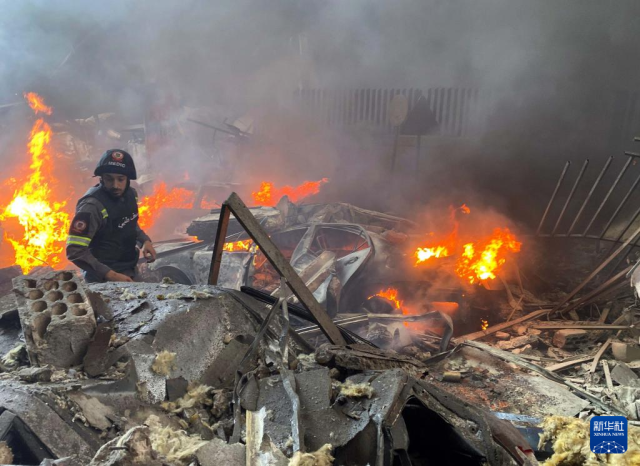4月8日,救援人员在黎巴嫩首都贝鲁特扑救以色列空袭引发的火灾(手机照片)。
