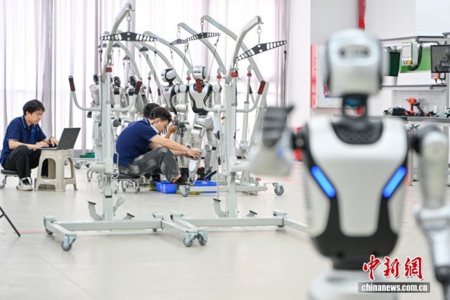 4月12日,位于广东深圳的乐聚机器人中试产线正式启用,这是深圳首条人形机器人中试产线。中试产线为人形机器人“试炼场”,旨在加快产品迭代打磨,为后续大批量生产“打样”。经过中试产线工艺验证与“准量产”打磨后的人形机器人,将奔赴佛山,在广东首条万台级人形机器人自动化产线完成生产并下线。图为技术人员在中试产线调试人形机器人。