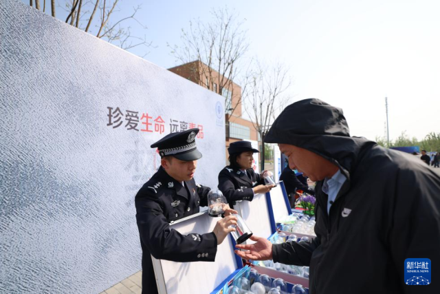 4月15日,在天津大学北洋园校区,民警为观众科普禁毒知识。