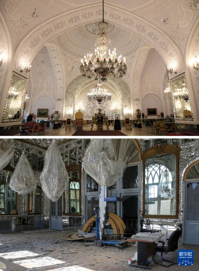 拼版照片:上图为2022年12月12日在伊朗首都德黑兰拍摄的古莱斯坦宫(新华社记者沙达提摄),下图为2026年3月3日在德黑兰拍摄的在空袭中受损的古莱斯坦宫(新华社发)。古莱斯坦宫又称“玫瑰宫”,是伊朗重要的王宫建筑群之一,2013年被联合国教科文组织列入世界遗产名录。自今年2月28日美以伊冲突爆发以来,古莱斯坦宫遭到直接打击并受到严重结构性破坏。