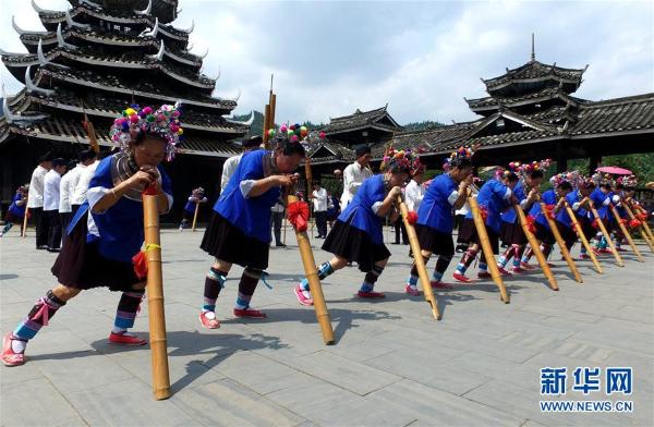 9月19日,村民在广西三江侗族自治县林溪镇冠小屯表演芦笙踩堂舞。