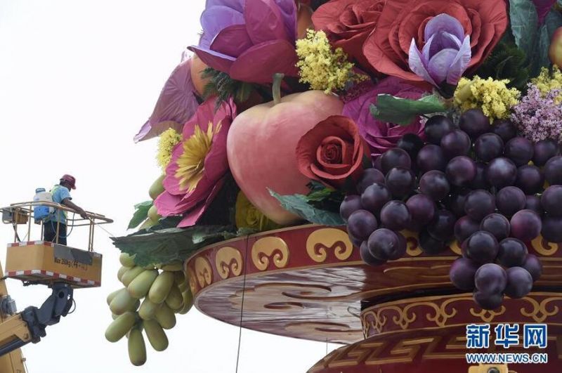 9月24日,工人在布置天安门广场“祝福祖国”巨型花篮。当日,天安门广场“祝福祖国”巨型花篮基本布置完毕。今年的大花篮以喜庆的“花果篮”为主景,篮内摆放柿子、石榴、苹果及牡丹、玉兰、月季等仿真花果,寓意十八大以来我国在各领域取得的辉煌成就。大花篮顶高17米、篮体高15.3米,底部花坛采用心形图案,直径达50米。篮体南侧有“祝福祖国,1949-2017”、北侧有“喜迎十九大”字样。从2011年开始,“祝福祖国”巨型花篮就一直作为广场中心花坛,在国庆节期间向祖国献礼。 新华社记者 罗晓光 摄