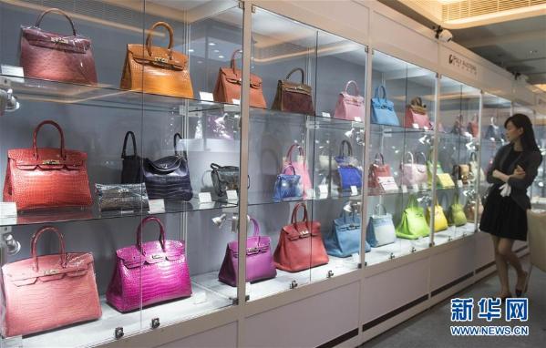 9月30日,在香港君悦酒店举行的保利香港2017年秋拍预展上,一位女士在观看待拍的名品手袋。