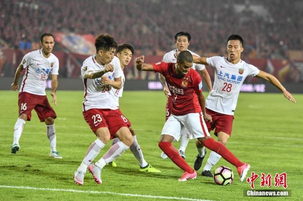 9月30日晚,广州恒大淘宝球员阿兰在进攻时被5名上海上港球员逼抢。当晚,2017年中国足协杯半决赛次回合赛事继续进行,广州恒大淘宝主场1比4不敌上海上港,上港以两回合6比2的总比分晋级决赛。中新社记者 陈骥旻 摄