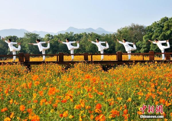 10月1日,在江西省上饶市铅山县鹅湖镇紫竹林,一群瑜伽爱好者在花海中表演功夫瑜伽。今年以来,铅山县各地大力打造秀美乡村建设,让农村面貌发生翻天覆地变化,成了人们旅游的目的地,吸引了众多游客来参观。丁铭华 摄