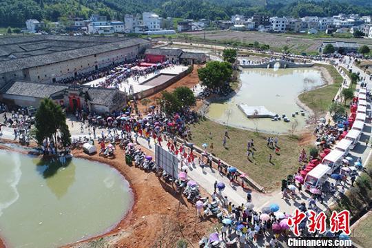 18对新人以传统客家习俗进行集体婚礼,在当地政府和广大游客的共同祝福和见证下喜结连理。一对对新人跨火盆、“过米筛”、拜天地、挑盖头、合卺酒,集体举行客家特色的婚礼,以实际行动告别婚事大操大办的陈规陋习。