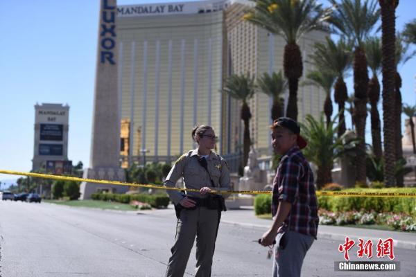 当地时间10月1日晚,美国西部旅游胜地拉斯维加斯发声枪击事件。一名枪手在曼德勒海湾酒店高层向正在参加露天音乐会的人群扫射,截至当地时间10月2日中午已造成50多人死亡。2日,警方在酒店四周拉起警戒线,警车和全副武装的警察严阵以待,不少媒体记者和游客也聚集于此。 中新社记者 张朔 摄