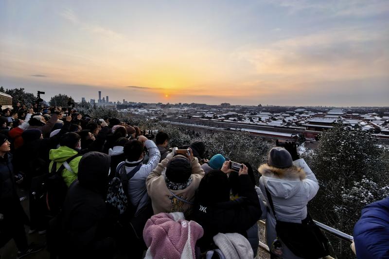12月9日下午,北京颐和园,游客们聚集在颐和园南湖岛一侧,拿出各种各样的设备拍摄十七孔桥“金光穿洞”。每年冬至前后,颐和园十七孔桥都会出现“金光穿洞”的壮观景象。在冬至前后,当太阳直射南回归线时,夕阳缓缓西沉,穿过十七孔桥的每一个孔洞,金色的光与古老的桥交织,吸引游客前来打卡拍照。中青报·中青网记者 田嘉硕/摄