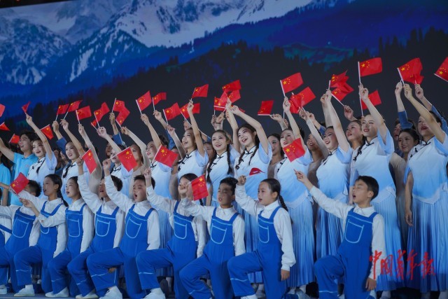 10月12日晚,江苏南京,“把青春华章写在祖国大地上”活动现场,节目《我爱你中国》,演员们在台上挥舞着国旗。当日,2025“把青春华章写在祖国大地上”大思政课网络主题宣传和互动引导活动在河海大学举行。活动紧扣青春爱国奋斗主题,结合新时代治水安邦、兴水利民的伟大实践,通过主题演讲、情景演绎、音乐舞蹈、互动分享等多种形式,以网为媒、以水为介,网上网下同上一堂大思政课。中青报·中青网记者 田嘉硕/摄