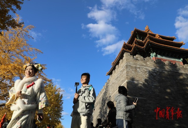 11月1日,北京故宫西南角楼下,一名身穿古装的女孩拿着糖葫芦准备拍照。时值深秋,故宫西南角楼下筒子河畔的几株银杏树树叶变黄,古韵与秋景交融,吸引众多游客特别是年轻人前来拍照打卡。据介绍,故宫的银杏树栽种始于明朝永乐年间,其中树龄最大的一棵,有近600年。有园林专家表示:古人对银杏的栽种,并非仅限于其观赏价值。他们更珍视银杏作为“活化石”的特殊地位,因为它与故宫一样,都是中华文明历史的重要见证。近年来,随着社交媒体的普及,每年10月下旬至11月初,故宫的银杏在社交网络上都处于高热度。中青报·中青网记者 陈剑/摄