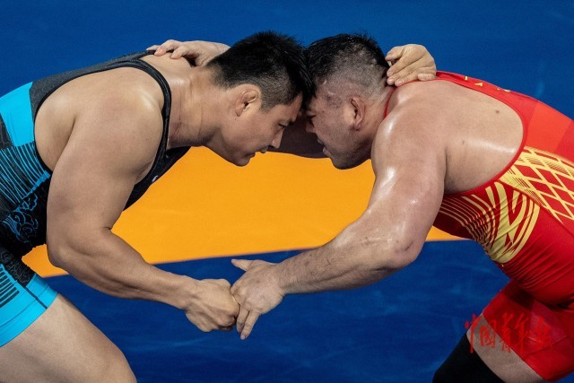 11月12日,广东清远,第十五届全国运动会摔跤男子自由式125公斤级决赛,北京队选手邓志伟(红)与山西队选手胡展翔在比赛中。邓志伟战胜对手,获得冠军。中青报·中青网记者 李隽辉/摄