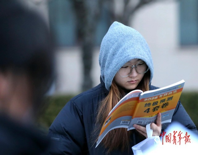 12月20日,北京化工大学考点,一位考生进入考场前抓紧时间看复习资料。当日,2026年全国硕士研究生招生考试初试正式开考。据统计,2026年全国硕士研究生招生考试报名人数为343万,连续三年下降。专家分析,考研降温背后是理性的回归,研究生教育由规模增长转向结构优化、质量提升,或将重塑研究生教育生态。中青报·中青网记者 陈剑/摄