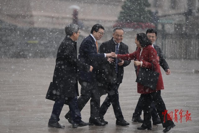 3月4日,北京,人民大会堂外,十四届全国人大四次会议预备会议后,走出会场的代表们相互致意。4日上午,十四届全国人大四次会议举行预备会议,选举大会主席团和秘书长,表决大会议程草案。当天北京下起了小雪,代表们在春雪中开启今年的全国两会之旅。中青报·中青网记者 李隽辉/摄